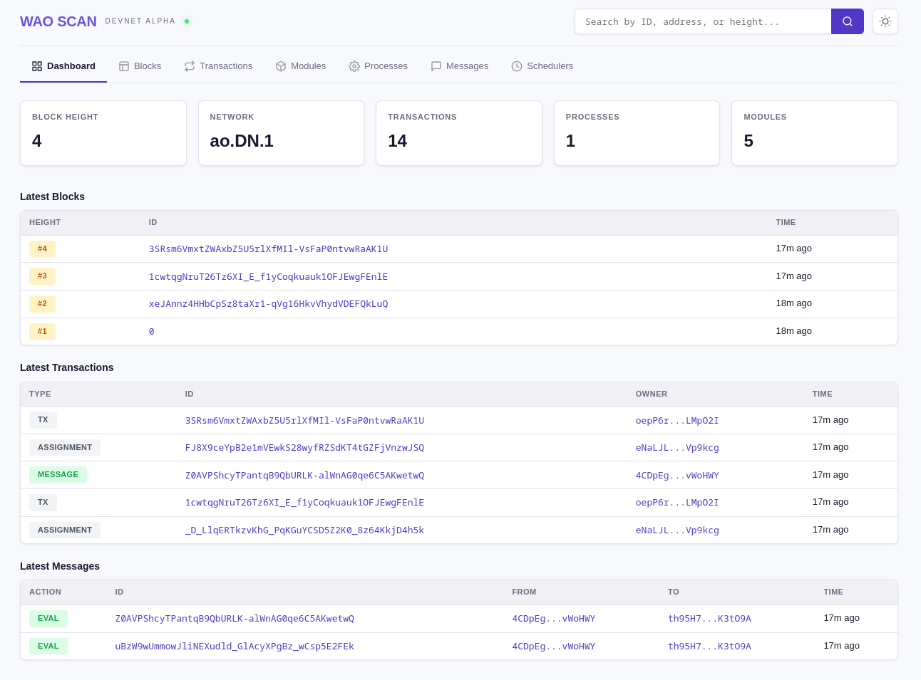 Every devnet instance ships with WAO Scan — a block explorer combining ViewBlock and AOLink into one. No separate tool to install — it's served at the root URL of your devnet.